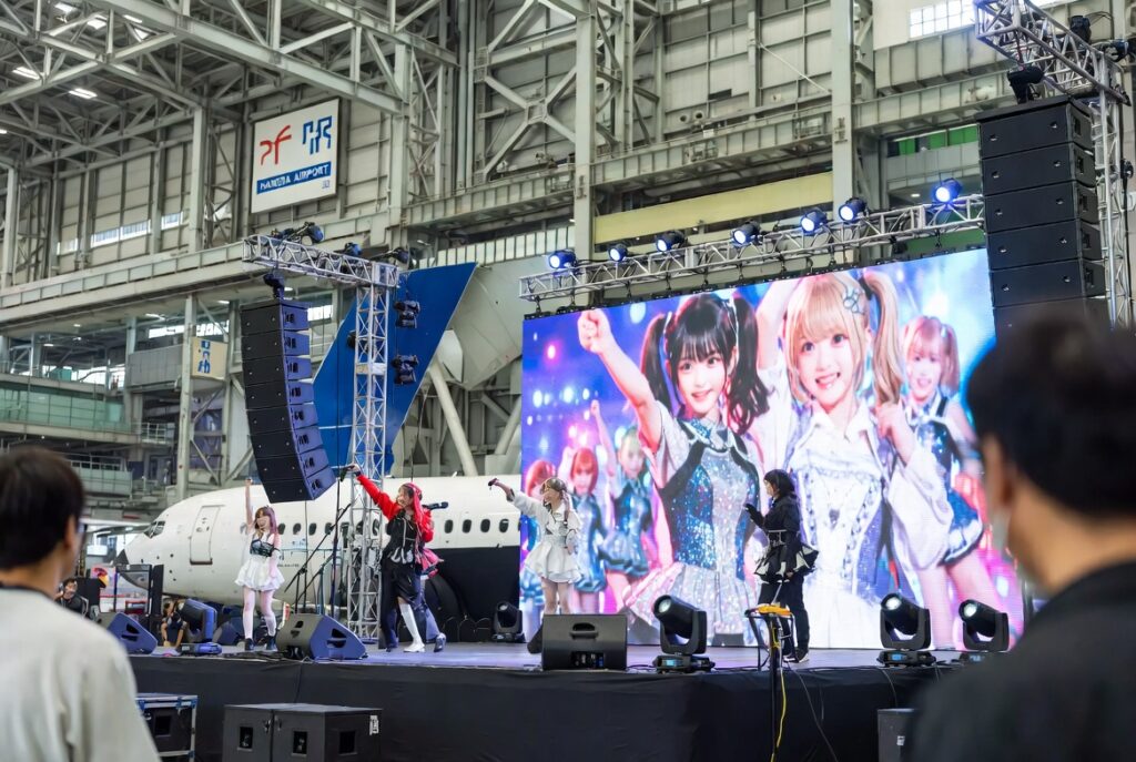 それでもスタッフが粘り強く各所に掛け合ってくれた結果、羽田空港の格納庫内の特設ステージでデビュー曲を披露することができました。